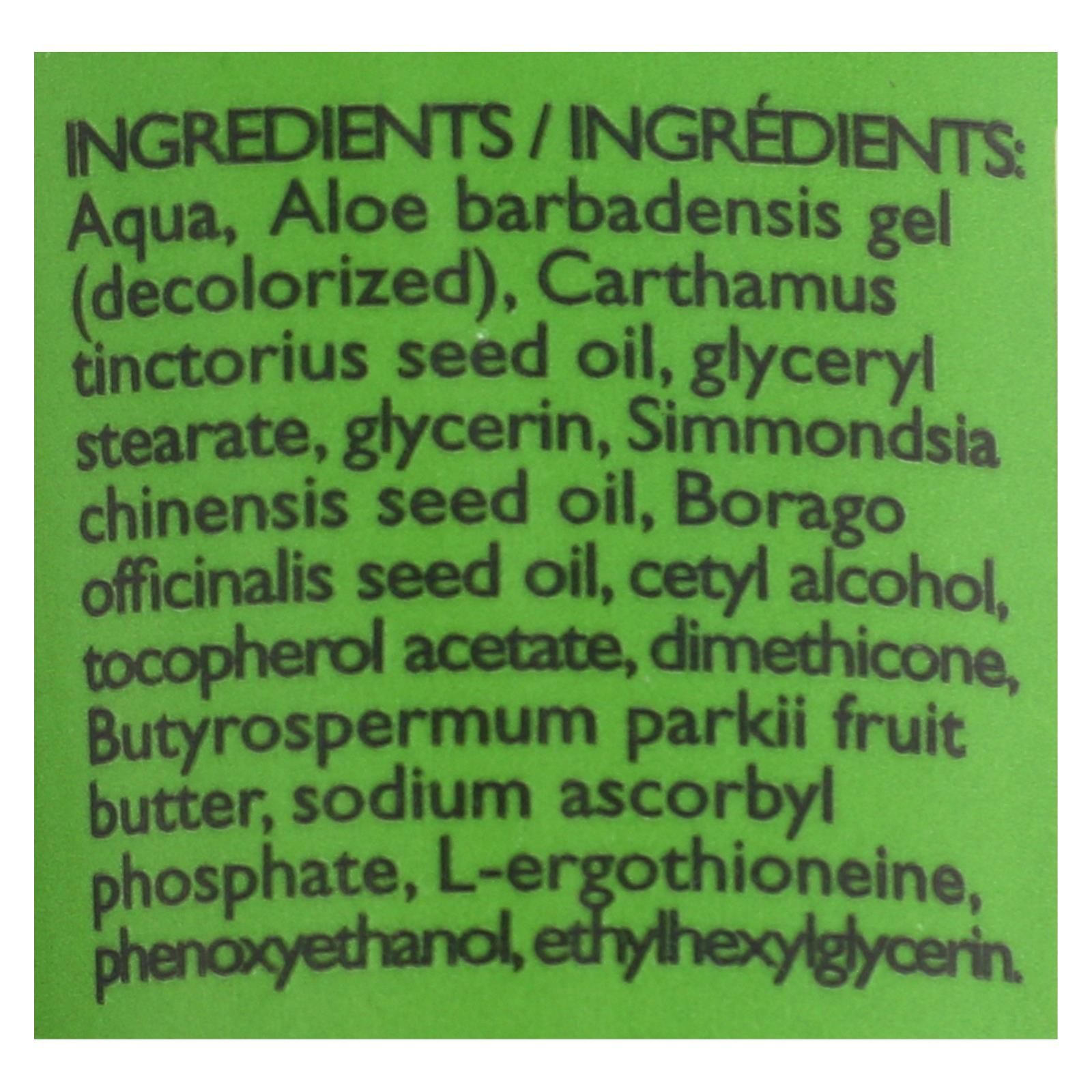 ingredients : aqua;aloe barbadensis gel;decolorized;carthamus tinctorius seed oil;glyceryl stearate;glycerin;simmondsia chinensis seed oil;borago officinalis seed oil;cetyl alcohol;tocopherol acetate;dimethicone;butyrospermum parkii fruit butter;sodium ascorbyl phosphate;l-ergothioneine;phenoxyethanol;ethylhexylglycerin
