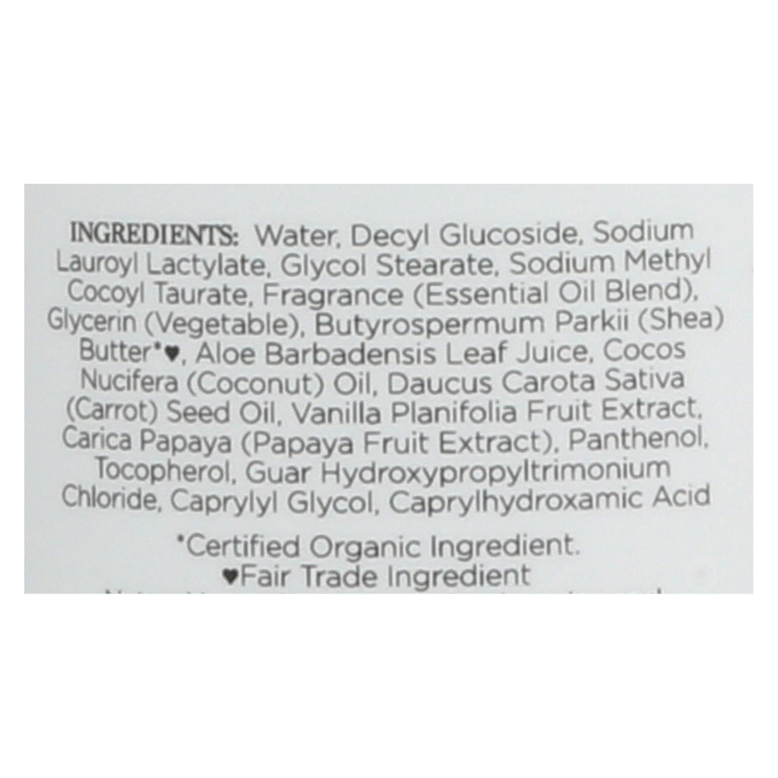 ingredients : water;decyl glucoside;sodium lauroyl lactylate;glycol stearate;sodium methyl cocoyl taurate;fragrance;essential oil blend;glycerin;vegetable;butyrospermum parkii;shea;butter*♥;aloe barbadensis leaf juice;cocos nucifera;coconut;oil;daucus carota sativa;carrot;seed oil;vanilla planifolia fruit extract;carica papaya;papaya fruit extract;panthenol;tocopherol;guar hydroxypropyltrimonium chloride;caprylyl glycol;caprylhydroxamic acid