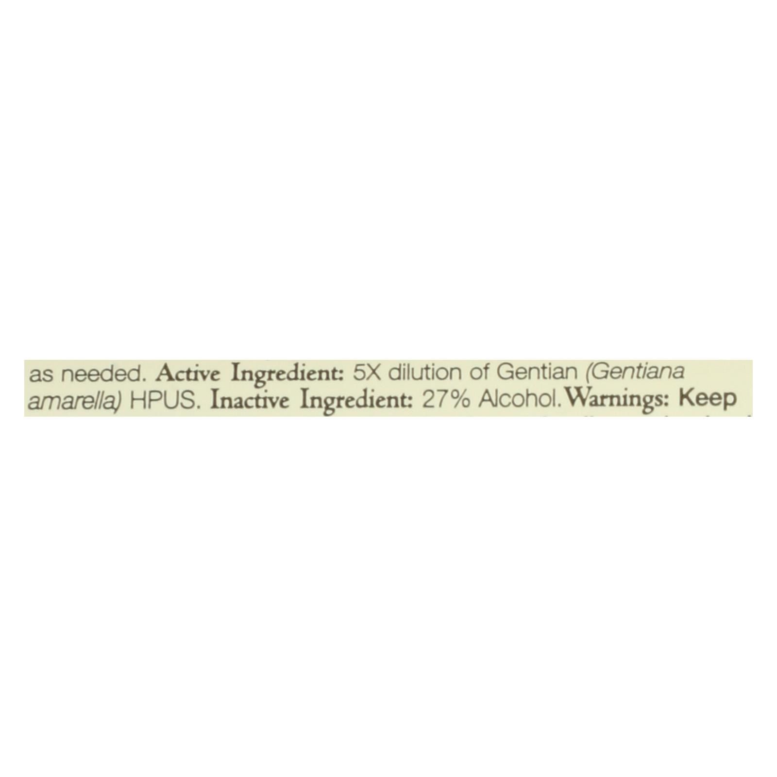 ingredients : active ingredient: 5x dilution of gentian;gentiana amarella;hpus. Inactive ingredient: 27% alcohol