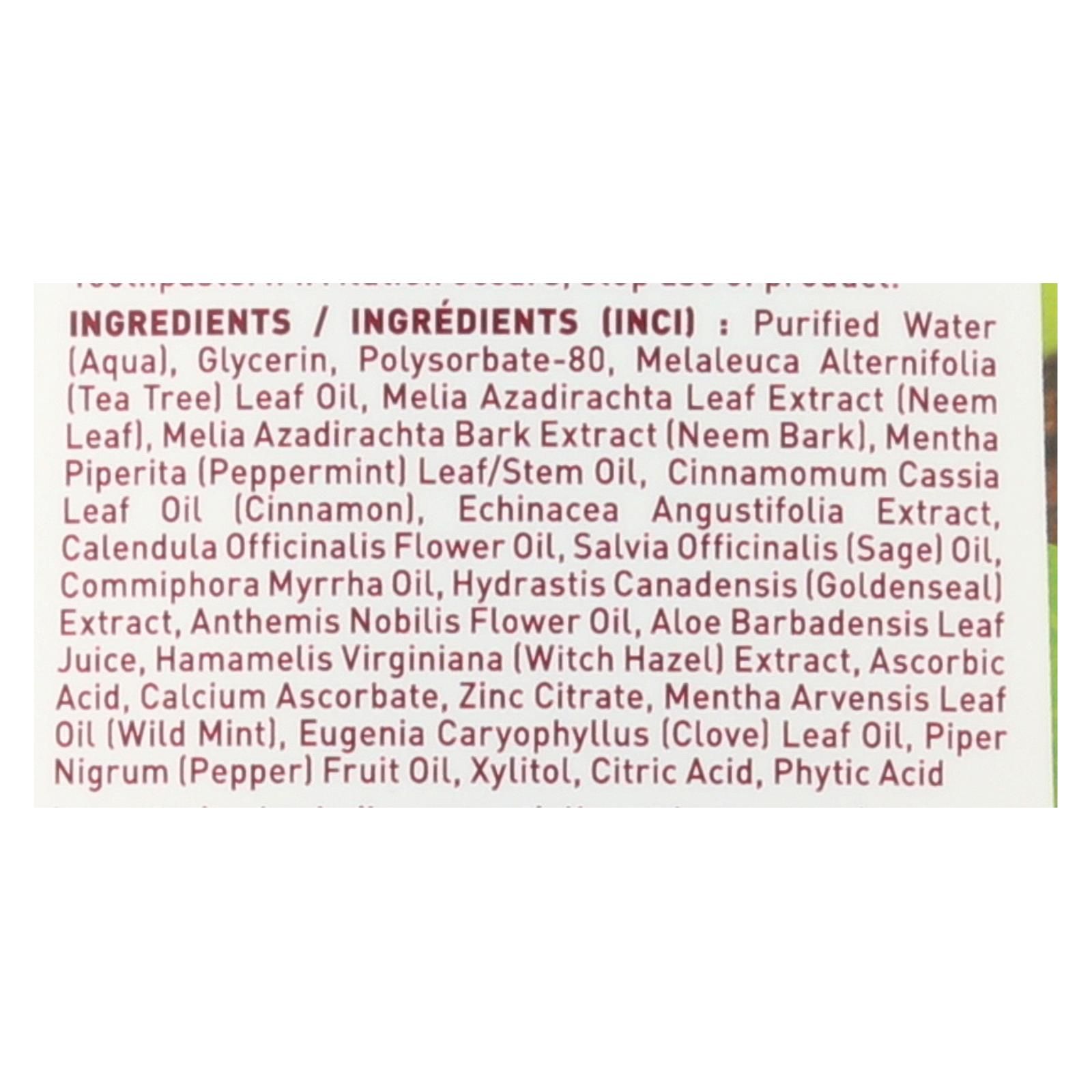 ingredients : purified water;aqua;glycerin;polysorbate-80;melaleuca alternifolia;tea tree;leaf oil;melia azadirachta leaf extract;neem leaf;melia azadirachta bark extract;neem bark;mentha piperita;peppermint;leaf/stem oil;cinnamomum cassia leaf oil;cinnamon;echinacea angustifolia extract;calendula officinalis flower oil;salvia officinalis;sage;oil;commiphora myrrha oil;hydrastis canadensis;goldenseal;extract;anthemis nobilis flower oil;aloe barbadensis leaf juice;hamamelis virginiana;witch hazel;ascorbic acid