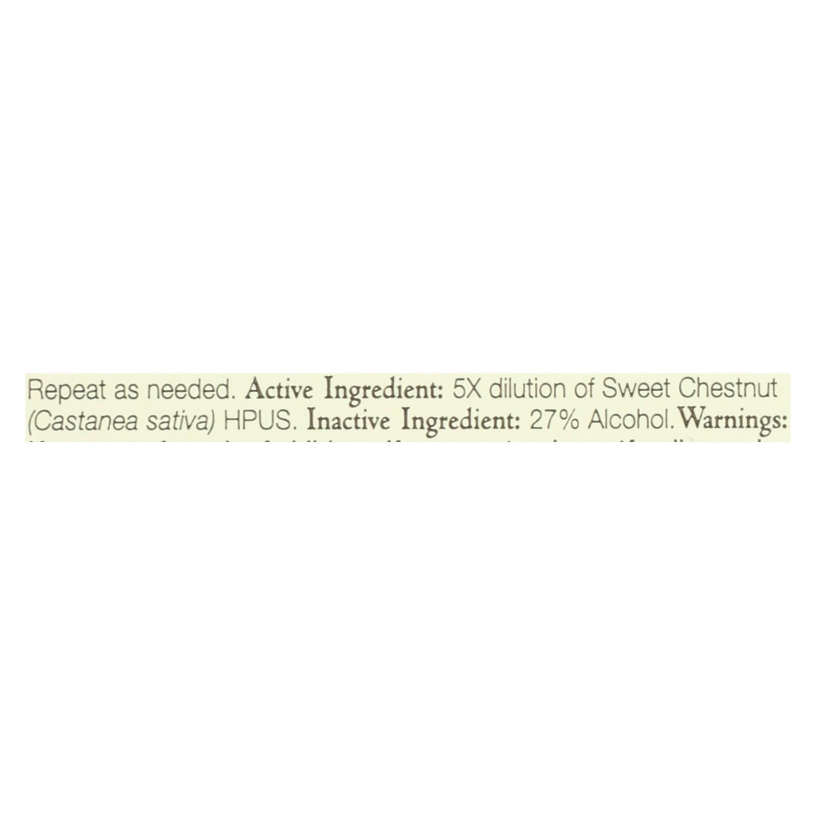 ingredients : 5x dilution of sweet chestnut;castanea sativa;hpus. 27% alcohol