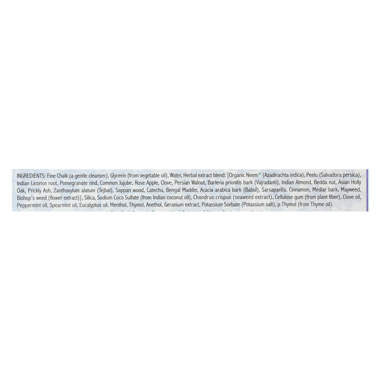 ingredients : fine chalk;a gentle cleanser;glycerin;from vegetable oil;water;herbal extract blend: [organic neem;azadirachta indica;peelu;salvadora persica;indian licorice root;pomegranate rind;common jujube;rose apple;clove;persian walnut;barleria prionitis bark;vajradanti;indian almond;bedda nut;asian holly oak;prickly ash;zanthoxylum alatum;tejbal;sappan wood;catechu;bengal madder;acacia arabica bark;babul;sarsaparilla;cinnamon;medlar bark;mayweed;bishop's weed;flower extract;];silica;sodium coco sulfate;f