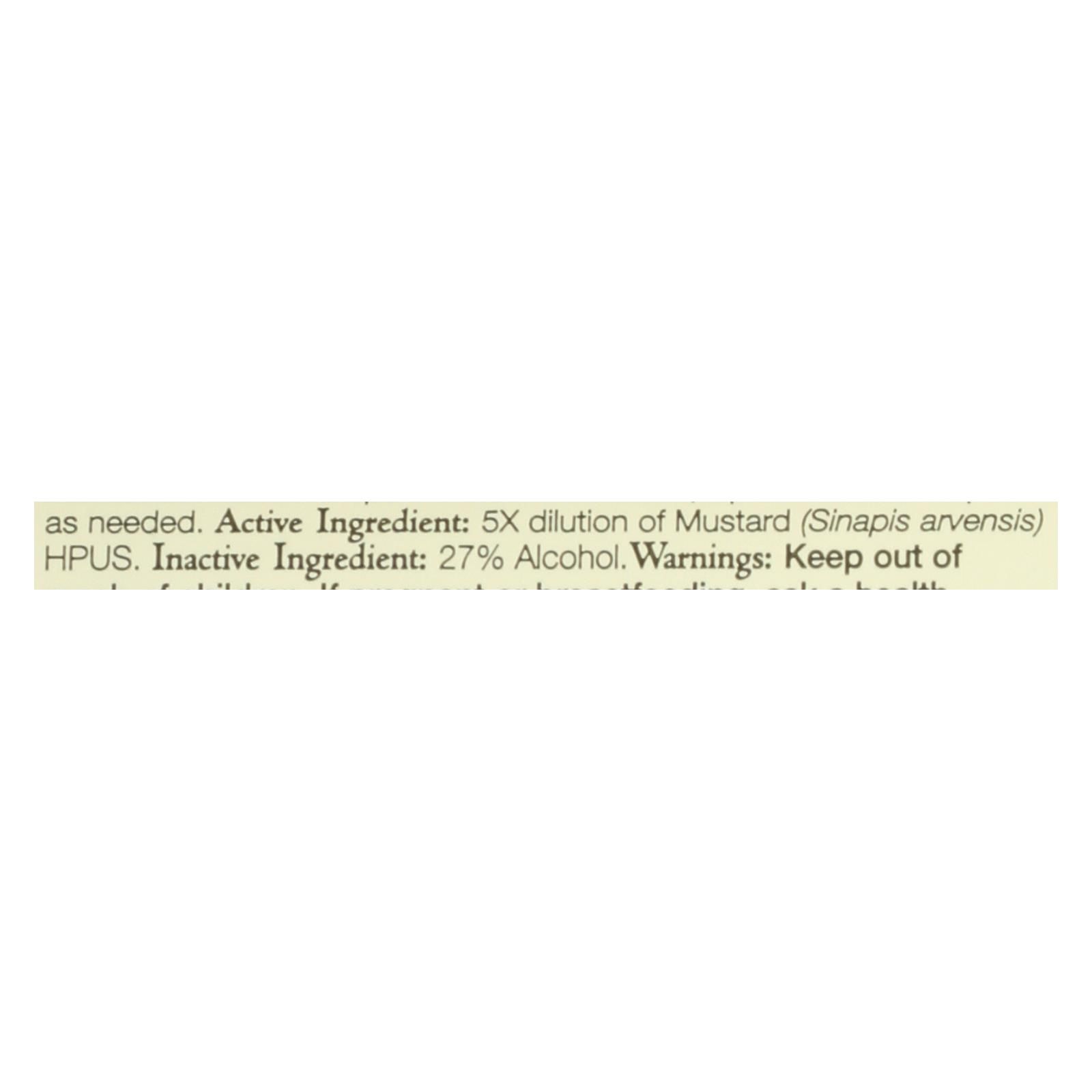 ingredients : active ingredient: 5x dilution of mustard;sinapis arvensis;hpus. Inactive ingredient: 27% alcohol