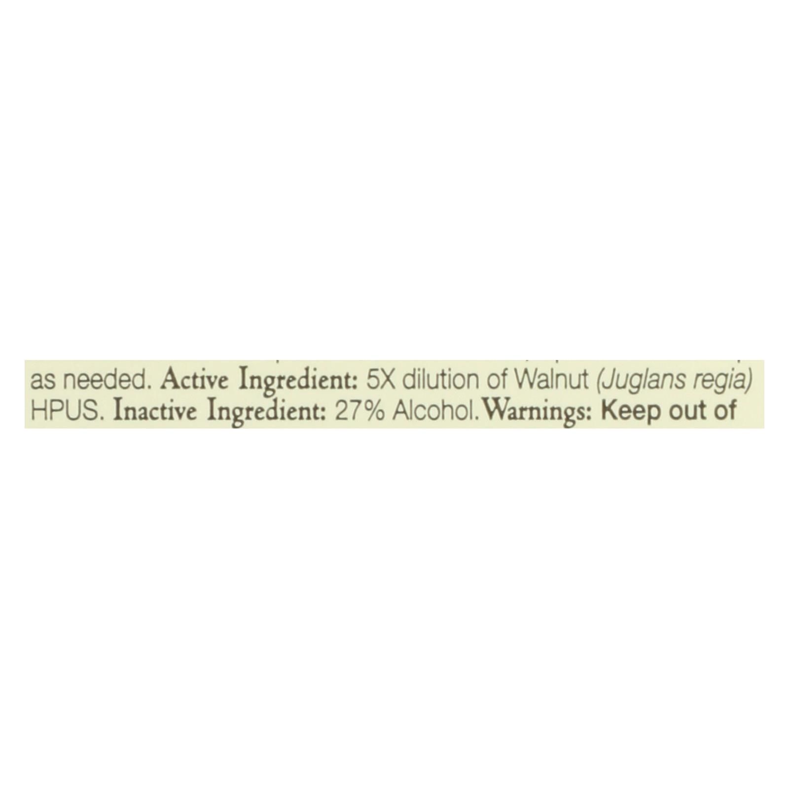 ingredients : active ingredient: 5x dilution of walnut;juglans regia;hpus. Inactive ingredient: 27% alcohol