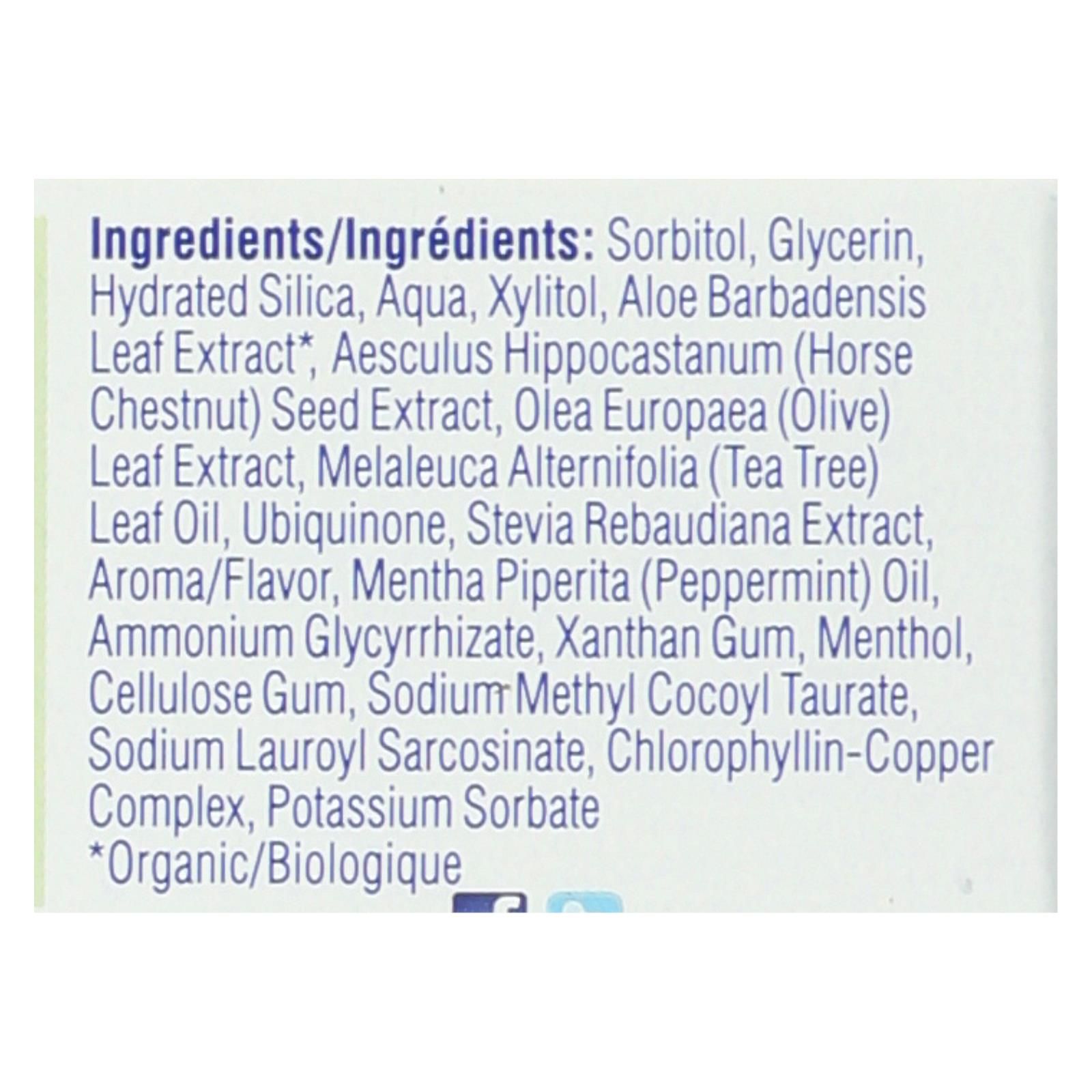 ingredients : sorbitol;glycerin;hydrated silica;aqua;xylitol;aloe barbadensis leaf extract;aesculus hippocastanum;horse chestnut;seed extract;olea europaea;olive;leaf extract;melaleuca alternifolia;tea tree;leaf oil;ubiquinone;stevia rebaudiana extract;aroma/flavor;mentha piperita;peppermint;oil;ammonium glycyrrhizate;licorice root extract;xanthan gum;menthol;cellulose gum;sodium methyl cocoyl taurate;sodium lauroyl sarcosinate;chlorophyllin-copper complex;potassium sorbate