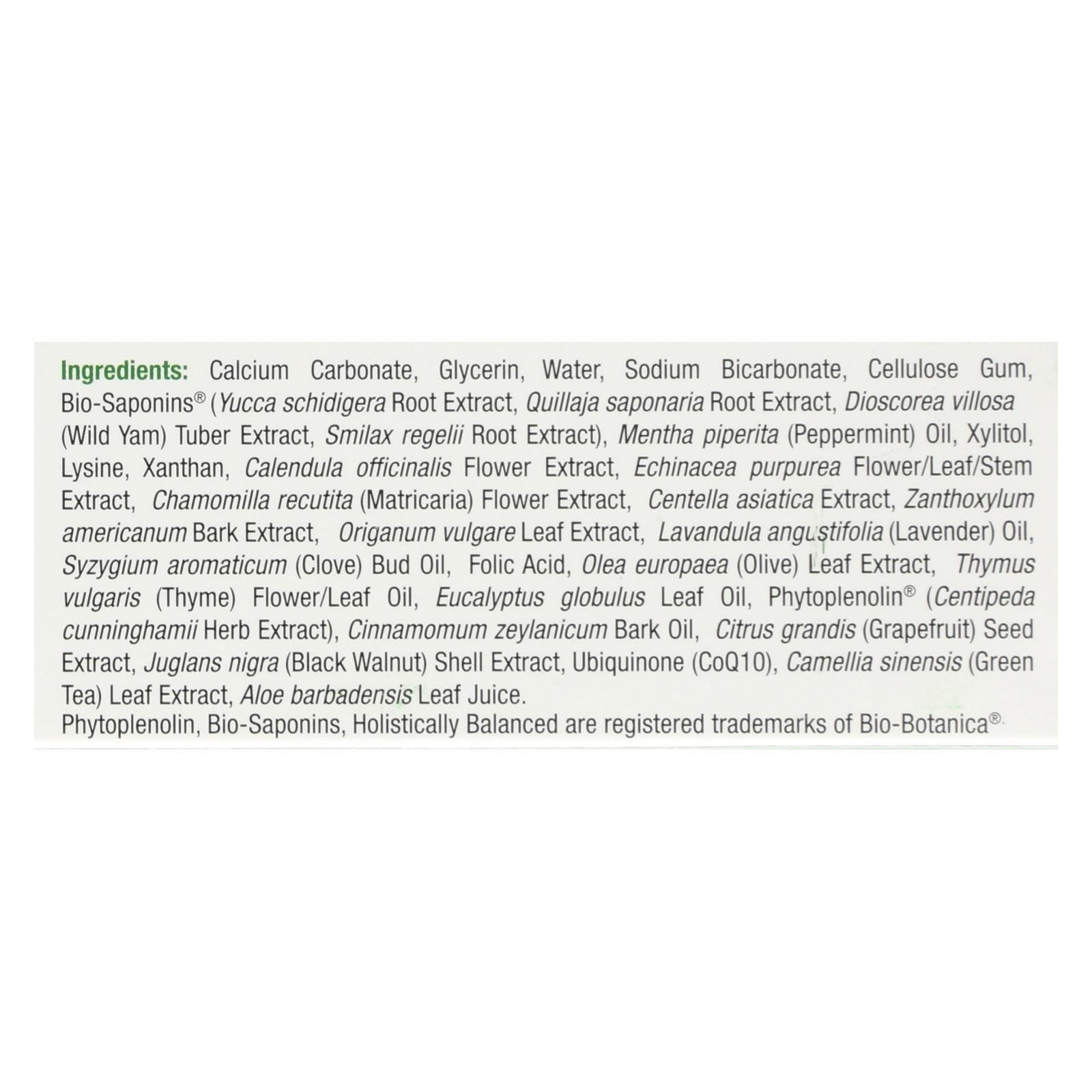 ingredients : calcium carbonate. Glycerin;water;sodium bicarbonate;cellulose gum;bio-saponins®;yucca schidigera root extract;quillaja saponaria root extract;dioscorea villosa;wild yam;tuber extract;smilax regelii root extract;mentha piperita;peppermint;oil;xylitol;lysine;xanthan;calendula officinalis flower extract;echinacea purpurea flower/leaf/stem extract;chamomilla recutita;matricaria;flower extract;centella asiatica extract;zanthoxylum americanum bark extract;origanum vulgare leaf extract;lavandula angus